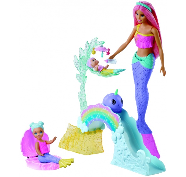 Užij si spoustu zábavy s tímto herním setem Dreamtopia, který ukrývá spoustu parádních doplňků! Pomoz Barbie® mořské víle s péčí o miminko a batole. Podívej, všichni tři mají pestrobarevný vršek a ocasní ploutev jako skutečné mořské panny! Užijte si společně spoustu zábavy při klouzání na duhové skluzavce nebo houpání na houpačce. Jakmile je čas si odpočinout, ulož miminko do kolíbky a batole do postýlky ve tvaru mušle. V setu na tebe čeká ještě jeden malý kamarád narval, který umí dokonce i stříkat vodu! A to ještě není vše! V každém balení se ukrývá narval v jiné barvě. Jaký bude ten tvůj?