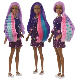 Vezmi si do parády vlasy panenky Barbie® a změň jejich barvu. Vyber si mezi pastelovými odstíny nebo výraznými, zářivějšími barvami! Malé kadeřnice mohou snadno změnit barvu panenčiných vlasů pomocí vody. Jednoduše aplikuj teplou vodu a vytvoř panence růžové, tyrkysové, nebo fialové melíry. Použij čtyři šablony na vlasy a nástroj a vytvoř panence jedinečný osobitý účes. Ozvláštni účes ještě více s dalšími pěti vlasovými doplňky, které zahrnují gumičky do vlasů, sponky a hřeben. Panenka Barbie® se oblékla do tmavě modrých šatů s pestrobarevným potiskem, který doplnila stříbrným náhrdelníkem a stříbrnými střevíčky na platformě a je připravena na stylovou zábavu a všechny příběhy, které si pro ni připravíš. Vyzkoušej jeden účes, poté ho smyj a vyzkoušej další. Užij si spoustu zábavy plné kombinování a ladění barev, šablon a zkoušení nových možností.