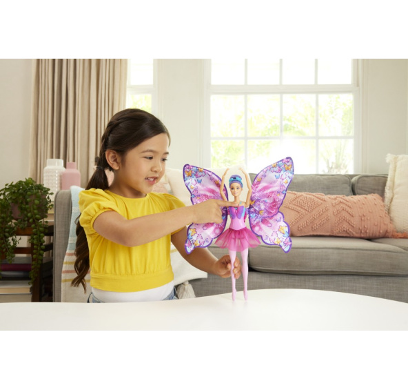 Barbie® Tanečnice s motýlími křídly podněcuje fantazii a nabízí kouzelnou proměnu 2 v 1! Stačí stisknout náhrdelník na živůtku panenky a sledovat, jak se její fialová svrchní sukně jako kouzlem rozvine do velkých třpytivých motýlích křídel. Děti si užijí tento parádní okamžik, který si budou rády opakovat znovu a znovu. Okouzlující fialový účes ve formě drdolu s květinovou čelenkou, oslnivý živůtek a baletní střevíčky dotvářejí její úžasný vzhled. Je báječným dárkem pro děti od 3 let. Panenka nemůže stát samostatně. Barvy a provedení se mohou lišit.