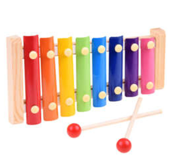 Hračka z přírodního dřeva s kovovými barevnými destičkami. Součástí sady jsou noty na cimbál, které vaše dítě bude moci použít, až se bude poprvé učit hrát na cimbál.
