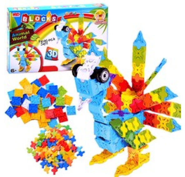 Tato kreativní, barevná sada 3D kostek vám umožní stavět trojrozměrné stavby, jako je například krásný páv na obrázku na obalu.