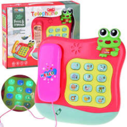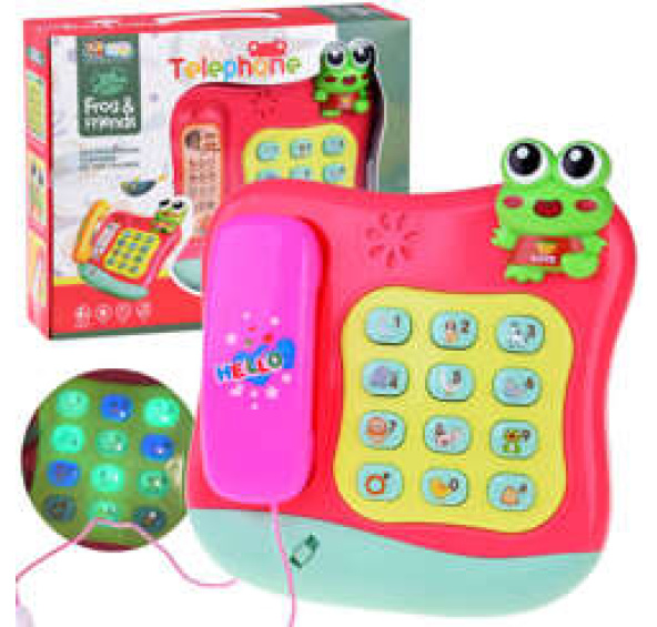 Barevný hudební telefon pro děti s veselou žabkou. Telefon má spoustu předinstalovaných zvuků a melodií. Každý klíč s číslem je navíc označen obrázkem zvířete. Když zvednete sluchátko, uslyšíte zvuk vyzvánění telefonu a uvítání, po kterém následuje veselá melodie a po zavěšení se ozve charakteristický zvuk zavěšeného sluchátka. Po stisknutí tlačítka uslyšíte název čísla nebo zvířete a zvuk, který vydává. Pod každým tlačítkem najdete jinou skladbu min. Happy Birthday nebo Let it go. Telefon také hraje hru na postřeh: tlačítka se náhodně rozsvěcují různými barvami a naším úkolem je co nejrychleji stisknout zvýrazněné tlačítko. Když hračku delší dobu nepoužíváte, rozloučí se a usne. Hračka vyslovuje slova a zpívá písničky v angličtině, což dětem pomůže naučit se a zapamatovat si slovíčka. Telefon má dvě úrovně hlasitosti.