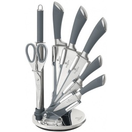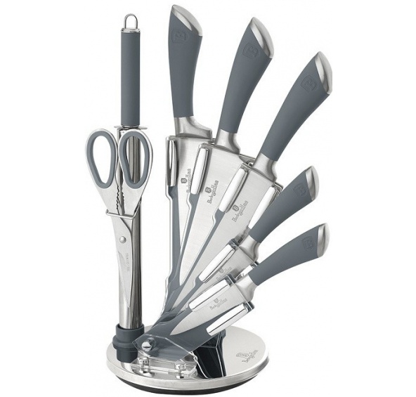 Sada nožů ve stojanu 8 ks nerez Infinity Line BERLINGERHAUS BH-2045 - materiál: nerezová ocel ergonomická rukojeť Sada obsahuje: nůž Santoku 17,5 cm kuchařský nůž 20 cm nůž na pečivo 20 cm univerzální krájecí nůž 12,5 cm loupací nůž 9 cm ocílka nůžky 360° otočný stojan barva: šedá značka: Berlingerhaus
