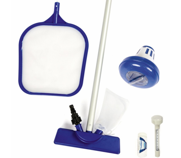 Tato sada na údržbu bazénu od značky Bestway obsahuje ruční bazénový vysavač, chemický plovák, bazénový teploměr, 50 testovacích proužku a 10 záplat.