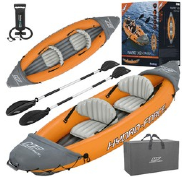 Dvoumístný nafukovací kajak LITE-RAPID X2 od společnosti Bestway je skvělým vybavením pro plavbu po jezerech, zátokách, řekách a kanálech nebo během letní dovolené u moře. Do kajaku o rozměrech 321 cm x 88 cm se snadno vejdou dvě osoby s maximální hmotností 160 kg. Pohodlí při plavání zajišťují nafukovací sedadla s opěradly vyztuženými popruhy. Kajak má měkkou podlahu s vnitřní I-nosníkovou konstrukcí, která spojuje horní a spodní část vnitřními popruhy. Zabraňují houpání kajaku a zvyšují jeho pevnost. Na přídi a zádi jsou praktická madla pro přenášení. Bostonské ventily umožňují rychlé nafukování a vyfukování. Za udržování směru a stability je zodpovědná ponořená ploutev nebo člun, který funguje jako balast. Zlepšuje manévrovatelnost a působí proti bočnímu větru. Kajak je vyroben z pevného a odolného PVC materiálu.