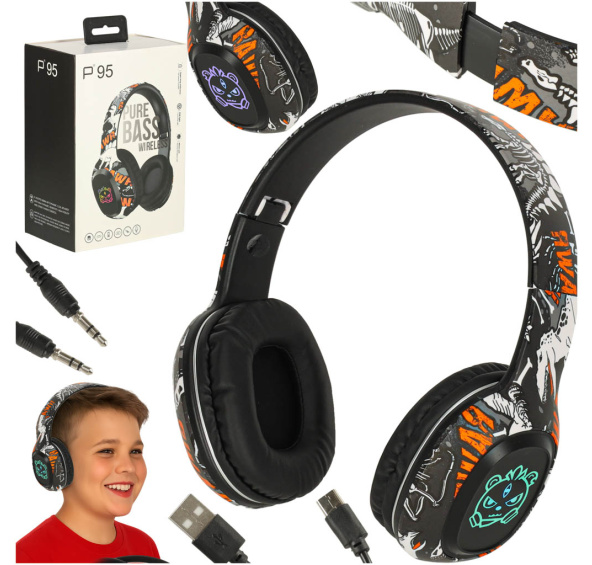 Bezdrátová sluchátka bluetooth s osvětlením se vyznačují originálním designem. Barevné pouzdro s multimediálními prvky zachovanými v moderní estetice přitahuje pozornost a vzbuzuje zájem dětí i dospělých. Ke kvalitě slyšitelného zvuku pozitivně přispívají 50mm měniče. Vestavěná tlačítka umožňují pohodlné ovládání hlasitosti nebo změnu skladby bez přímé interakce s externím přehrávačem.