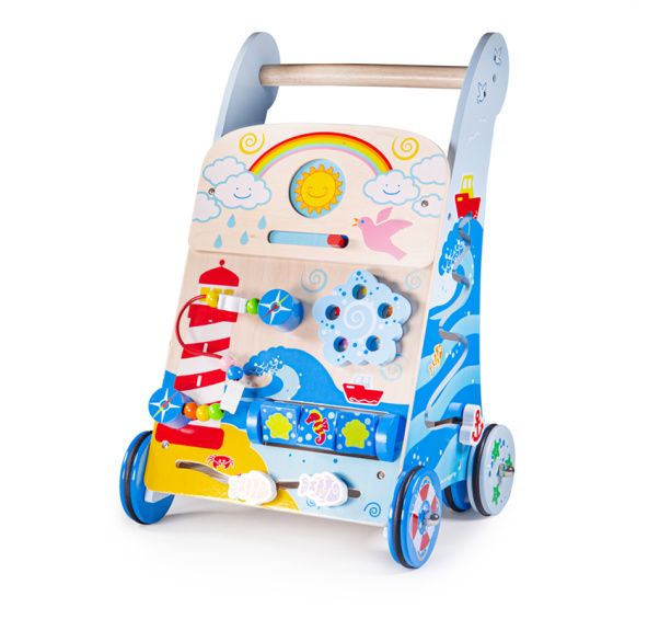 Podpořte pohyblivost a zručnost vašeho dítka. Chodítko plné podmanivých funkcí je inspirováno mořským životem. Pomocí posuvníku si vyberte mezi měsícem a sluncem, pak roztočte barevné kolo, spojte tři mušle nebo tři mořské koníky otáčením kostek a pomozte ptáčkům létat nahorů a dolů po korálkovém drátu. Navíc nezapomeňte na ryby, které čekají na plavání! Na každé straně chodítka najdete ještě více aktivit s kotvou, kterou lze zvedat a spouštět po jezdci na jedné straně a třídičem tvarů na druhé straně se třemi barevnými tvary (každý s designem inspirovaným mořem). Obsahuje robustní rukojeť, která je ideální pro uchopení malých ručiček, a pestrobarevná kolečka. Vyžaduje montáž dospělých. Vyrobeno z vysoce kvalitních, zodpovědně získaných materiálů. Hlavní vlastnosti: multifunkčnostrobustní rukojeťpestrobarevná kolečka