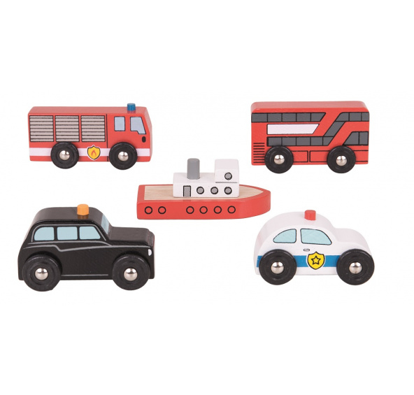 Je čas se zaměstnat a přidat do rozvržení tratě další provoz! Černý taxík, červený dvoupatrový autobus, hasičský vůz, policejní auto a loď tvoří tuto flotilu městských vozidel. Nekonečné hodiny kreativní zábavy.Součástí balení je vše dle obrázku. Hlavní vlastnosti: Vláčkodráhy a jejich příslušenství značky Bigjigs Rail je možno kombinovat se všemi dalšími dřevěnými vláčkodráhami na trhu.Vyrobeno z kvalitních a zodpovědně získaných přírodních materiálů.Odpovídá současným evropským bezpečnostním normám.Podporuje představivost, obratnost a koordinaci.