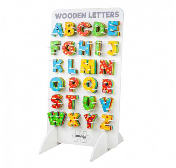Dřevěná hvězdičková písmenka. Dodáváno bez stojanu. Obsahuje: 32 balíčků písmen extra balíčky písmen A, E, I, L, R, O.každé balení obsahuje 6 písmen v barvách: 2x červená, 2x modrá, 1x zelená a 1x žlutácelkem displej obsahuje 192 písmen