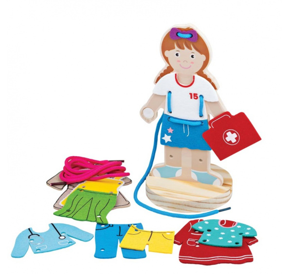 Co si dnes oblečeme? Tato dřevěná postavička je připravena a čeká, až ji obléknete. Kombinujte a slaďte outfity tak, že je připevníte na dřevěnou desku pomocí přiloženého provázku. Postavička má předděrované otvory dokonale dimenzované na provlečení provázku. Navlékáním šatů děti trénují svou jemnou motoriku prstů. Hlavní vlastnosti: podporuje kreativituskvělý způsob, jak rozvíjet obratnost a koordinaci ruka/okovyrobeno z vysoce kvalitních, zodpovědně získaných materiálůsplňuje aktuální evropské bezpečnostní normy