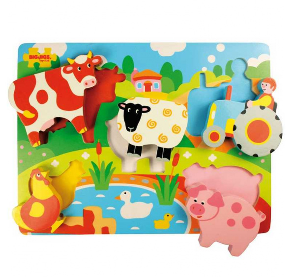 Robustní 5-ti dílné vkládací puzzle se zvířátky.Anglická značka Bigjigs byla založena roku 1985 a zpočátku se zabývala výrobou pouze dřevěných puzzlí. Majitelé vyráběli vše ručně s láskou v malém zahradním domku, své výrobky prodávali na trhu. Spokojení zákazníci výrobce motivovali k mnoha dalším nápadům a rozšíření nabídky o další dřevěné hračky. Přibylo zasílání poštou a prodej přes katalog. Spokojenost a věhlas značky rostla, takže následoval velkoobchodní prodej a pro udržení výrobních cen přesun a rozšíření výroby na východ. Nové značky kvalitních a nápaditých hraček si v Anglii všimly další velké prodejní firmy.Dnes Bigjigs hračky zůstávájí ve vlastnictví rodiny s obrovskými sklady v jiho-východní Anglii. Společnost i nadále dodává své hračky široké zákaznické základně ve Velké Británii a západní Evropě podpořená loajálním, oddaným a tvrdě pracujícím týmem zaměstnanců. Veškeré dřevěné hračky BigJigs jsou navržené v Anglii a vyrobené jak tamtéž, tak i ve východní Evropě a jihovýchodní Asii. Kvalita hraček značky BigJigs je testována a odpovídá všem podmínkám pro prodej v EU a USA.