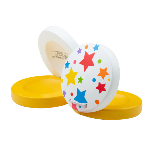 Cena je uvedena za 1 ks. Tyto dřevěné, barevné kastaněty s hvězdičkami jsou perfektní pro úvod do světa hudby. Děti se s nimi naučí zvuku a rytmu a kastaněty je také podpoří v kreativitě. Pomáhají rozvinout zručnost a koordinaci dětí. Vyrobeno z kvalitních materiálů z odpovědných zdrojů. Odpovídá evropské bezbečnostní normě. Hlavní vlastnosti: rozvíjí jemnou motoriku a kreativituhravý úvod do světa zvuku a rytmuvyrobeno ze dřeva a kovu