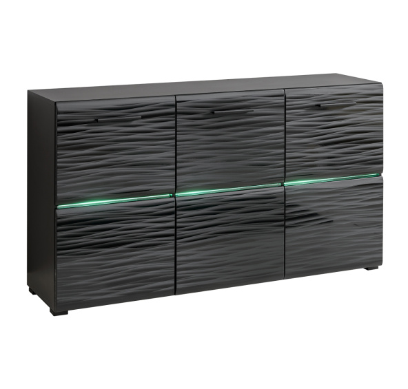 Popis produktu BLADE4 komoda KOM SB czarny / sahara połysk BLADE4 Komoda SB wymiary: długość: 150 cm wysokość: 86 cm głębokość: 41 cm materiał: Korpus: czarny matowy MDF Fronty: sahara wysoki połysk Uchwyty: plastikowe