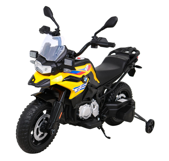 Popis produktu BMW F850 GS Dětský motocykl na baterie žlutý + asistenční kolečka + LED audio + pomalý start + EVA
