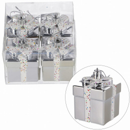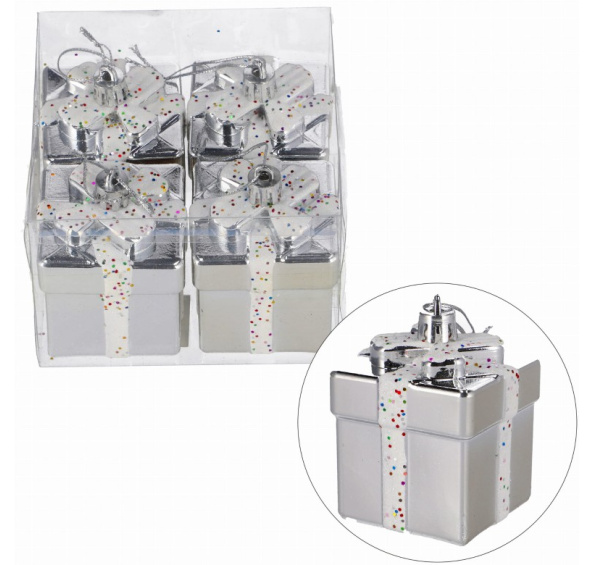 Stříbrné ozdoby ve tvaru dárku na vánoční stromeček