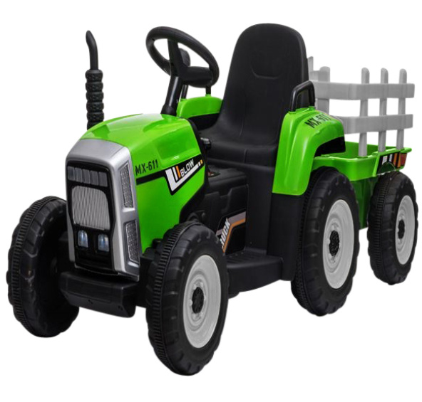 Elektrický traktor s vlečkou pro malého řidiče udělá spousty zábavy každému malému zemědělci. Traktor s přívěsem se světelnými a zvukovými efekty. Skvělý způsob, jak si hrát na zahradě nebo na hřišti. Nyní můžete poskytnou pomocníkovi traktor s vlečkou, díky kterému bude malý řidič například přepravovat suché větve nebo listí na správné místo nebo přepravovat hrábě, lopaty a kbelíky do pískoviště. Vozidlo řídí samo dítě, které sedí za volantem. Vozidlo je obecně určeno pro venkovní použití, ale jeho ergonomický design je příznivý a umožňuje jeho použití i ve větších místnostech, jako je terasa nebo obývací pokoj.