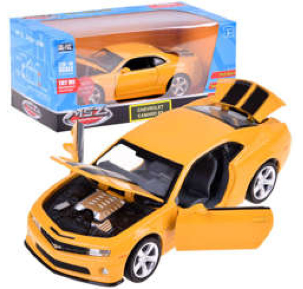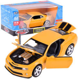 Chevrolet Camaro SS 1: 32 ve sportovní grafice je ideální pro fanoušky rychlé jízdy. Zamilovali jste si žlutého Bumblebeeho při sledování filmů Transformers? Zamilujete si také náš Chevrolet Camaro, nezaměnitelnou hvězdu filmů o Autobotech. Vůz byl vyroben velmi pečlivě a esteticky s důrazem na nejmenší detaily, což jistě potěší každého malého závodníka. Auto má zvukové a světelné efekty, otevírací dveře, kapotu a zavazadlový prostor. Autíčko jezdí tak, že se pohybuje po hladkém povrchu dozadu pomocí Friction power, mechanismu, který zrychluje pohybem hračky po hladkém povrchu.