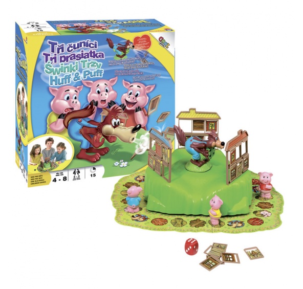 Hladový vlk mlsně číhá na čuníky, kterým se snaží svým mohutným fouknutím rozbořit jejich domečky.