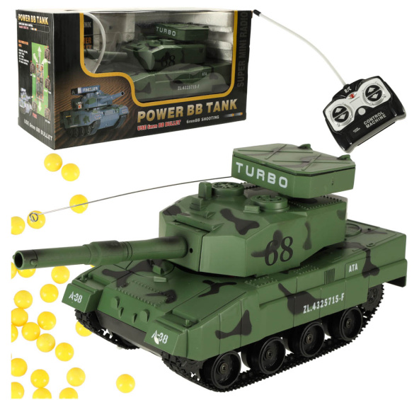 Tank jede vpřed a otáčí se. Po stisknutí tlačítka na dálkovém ovladači vystřeluje plastové kuličky. Plastové míčky jsou součástí balení. Vzdálenost střelby až 3,5 m. Průměr kuličky 6 mm. Napájení: 8 baterií AA. Rozměry: 25x10x12 cm.