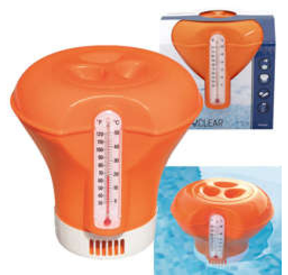 Dávkovač chemikálií umožňuje plně kontrolované a bezpečné dávkování chemikálií. Stačí naplnit dávkovač chemikálií, nastavit intenzitu dávkování pomocí speciálního nastavitelného kroužku a umístit jej do vody.