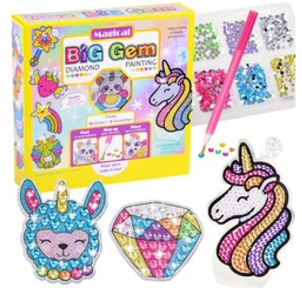 Kreativní sada MAGIC s diamantovou výšivkou je nejmódnější kreativní hrou pro děti v této sezóně. Sada umožňuje vytvářet nádherné vzory s pohádkově barevnými diamanty. Hra spočívá v přiřazování správných barev diamantů a jejich přenášení na šablonu pomocí lepidla a speciálního pera. Po uspořádání dílků vznikne nádherná barevná dekorace. Pomocí přiložených plastových talířků a silikonových přísavek s háčky lze hotová díla umístit například na zeď. na psacím stole, na poličce, zavěsit je na sklo či zrcadlo nebo si jimi ozdobit oblíbený sešit, složku či diář.