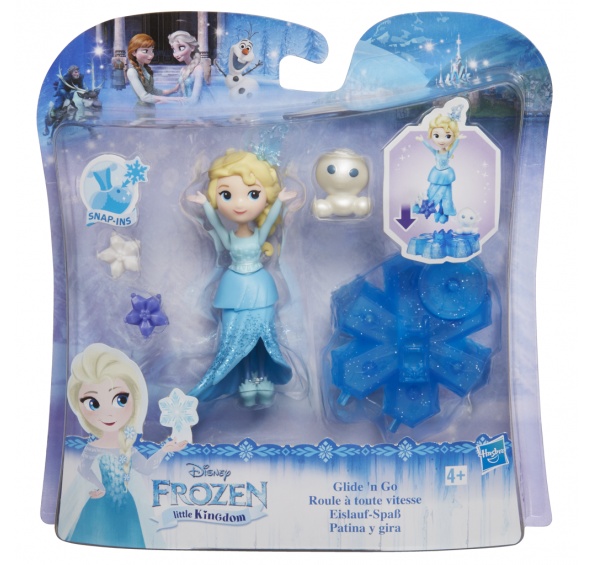 Oblíbené postavičky panenek z filmu Ledové království nyní s příslušenstvím – sněhovou vločkou, která jim pomáhá pohybovat se po stole. Malý Snowgie se přitom otáčí kolem panenky.