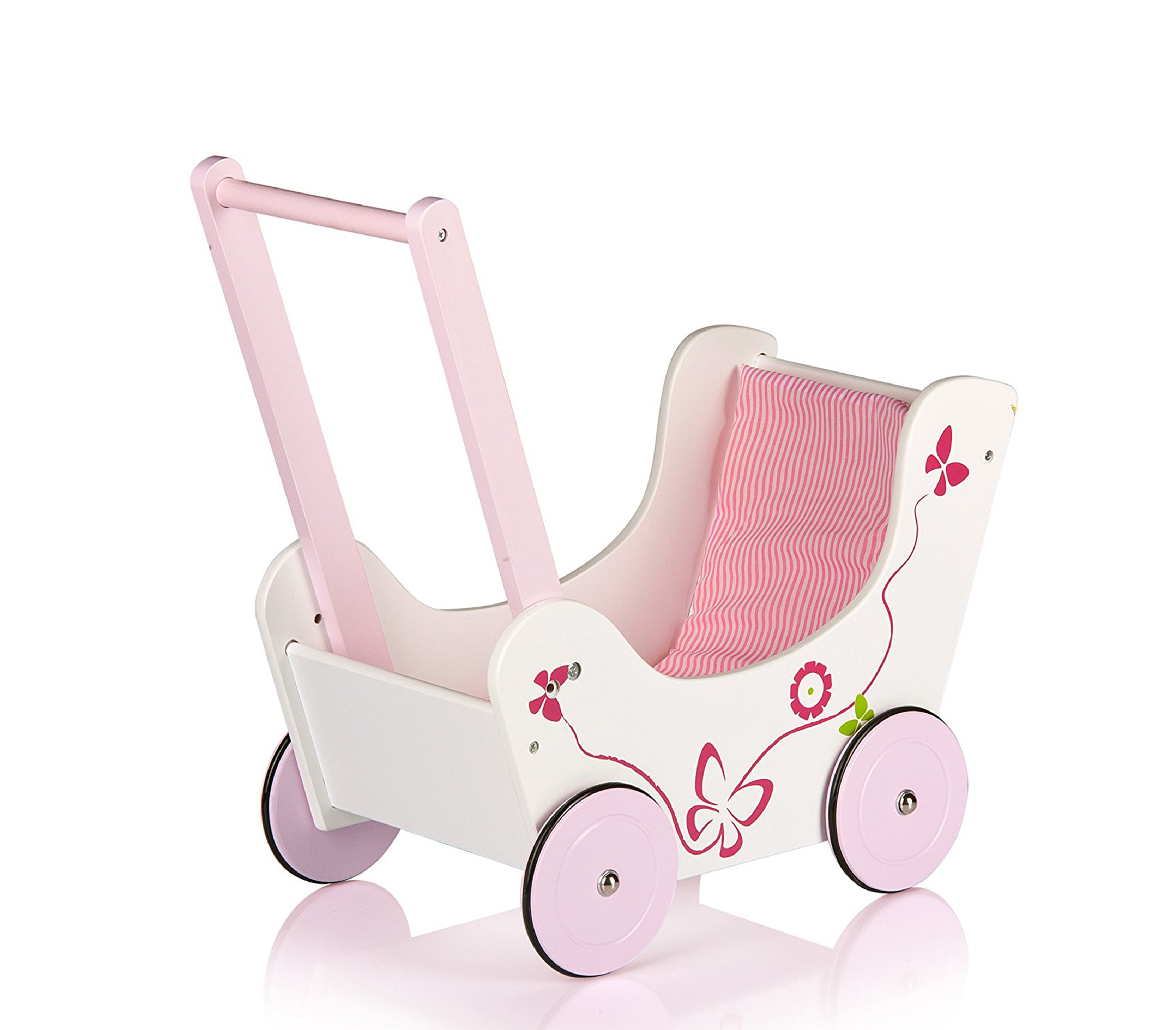 Tento hezký dřevěný kočárek pro panenky udělá radost každé malé slečně, která si ráda hraje s panenky a plyšovými hračky.
