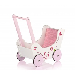 Klasický vzhled kočárku bílé barvy s motivy motýlků, růžovými kolečky a rukojetí se ideálně hodí do každého dětského pokojíčku.