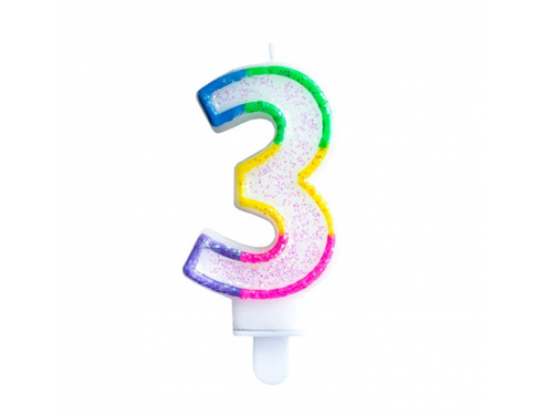 Třpytivá svíčka číslo "3" s duhovým okrajem je dokonalá dekorace dortu.