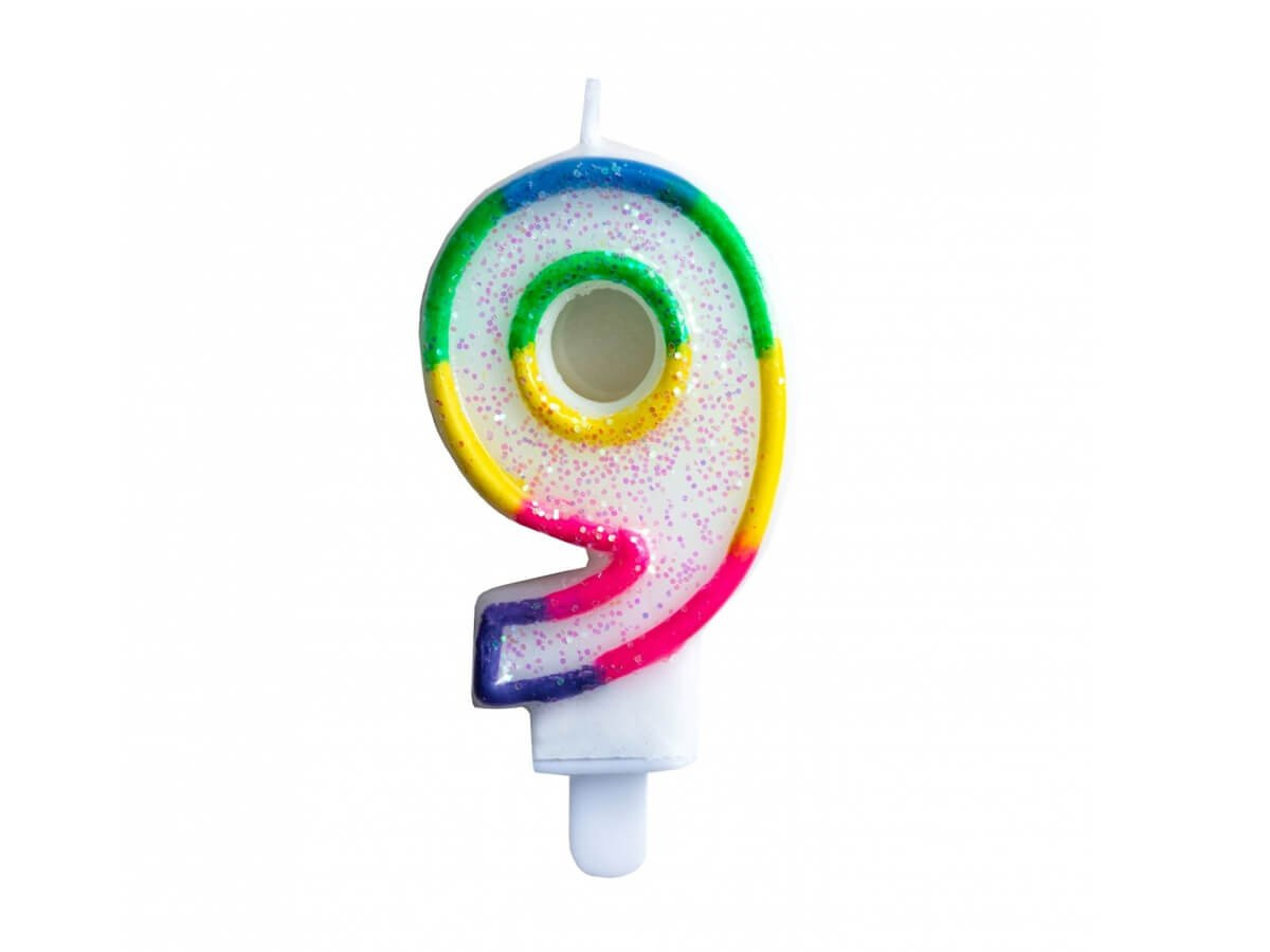 Třpytivá svíčka číslo "9" s duhovým okrajem.