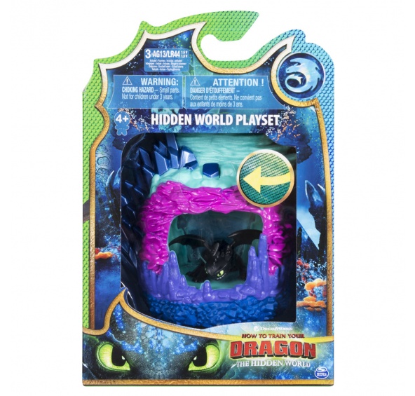 Vytvořte si dračí svět jako ve filmu Jak vycvičit draka 3 s ukrytou dračí jeskyní. Každý set obsahuje barevnou jeskyni a jednu figurku draka. Stiskněte tlačítko ve tvaru kamene a aktivujte UV světlo, pro objevení biolumiscentních ornamentů.
