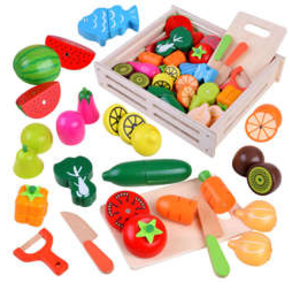 Dřevěná zelenina a ovoce ke krájení v přírodním boxu s prkénkem a bezpečnostními noži. Soubor přirozeně rozmnožených druhů zeleniny, ovoce a ryb přinese kulinářské revoluce. Děti rády napodobují dospělé a jejich každodenní činnosti, taková sada je pro ně výzvou. Zelenina, ovoce v půlkách mají připevněné magnety, takže se dají snadno rozdělit a dítě si může procvičit ruce tím, že je rozkrojí na půlky a meloun dokonce na čtvrtky. Skvělý způsob, jak povzbudit malé kuchaře ke hře.