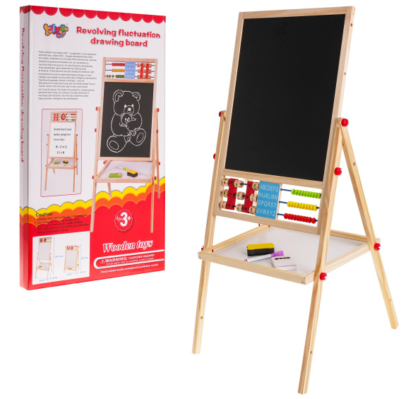 Velká oboustranná dřevěná tabule s počítadlem, hodinami, matematickým děličem a doplňky je vzdělávací hračka pro děti od 3 let. Tabule je z jedné strany bílá magnetická a z druhé strany černá křídová. Bílá strana slouží k psaní perem, které je součástí sady. Pero je opatřeno magnetem, takže je možné jej připevnit k tabuli, a gumou. Na černou stranu můžete malovat křídou, která je součástí sady, a pak vše vymazat houbičkou. Desku lze namontovat ve dvou polohách, nižší a vyšší.