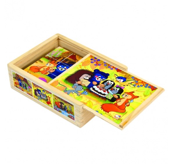 Zasouvací dřevěná krabička plná dřevěných kostek s obrázky. Sestavte veselé obrázky s paní Krtečkovou a jejími kamarády. Oblíbená tradiční hračka, kterou děti milují. Krabička obsahuje 12 ks kostiček.