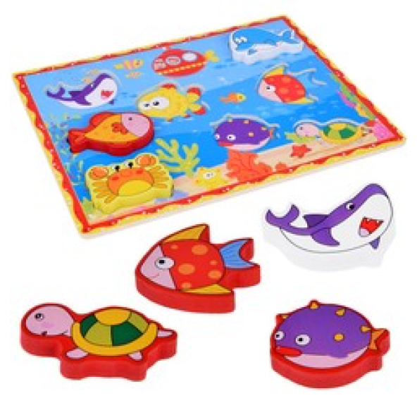 Úkolem dítěte je přizpůsobit puzzle ilustraci a tvaru na dřevěné desce.