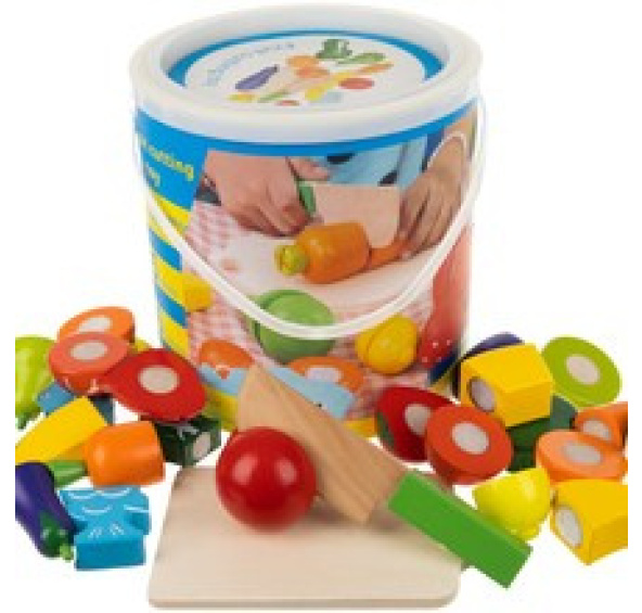 DŘEVĚNÉ OVOCE A ZELENINA K ŘEZÁNÍ NA VELCRO V KYBLÍKU