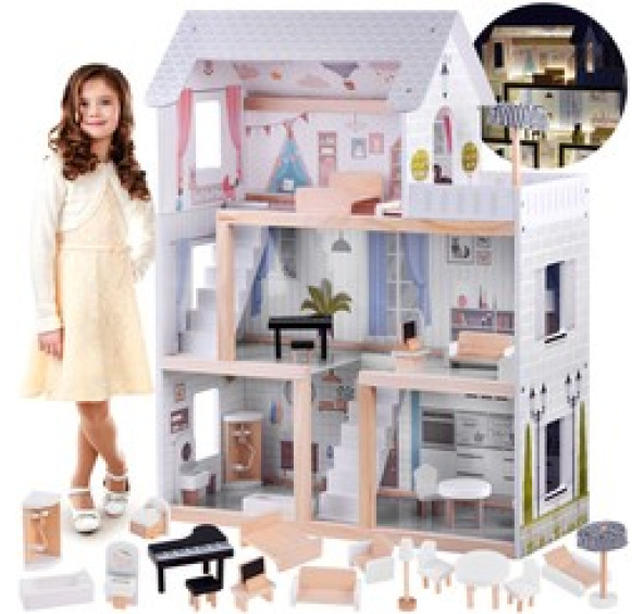Dřevěný domeček pro panenky, patrový domek s nábytkem, led osvětlení, schody, boho styl