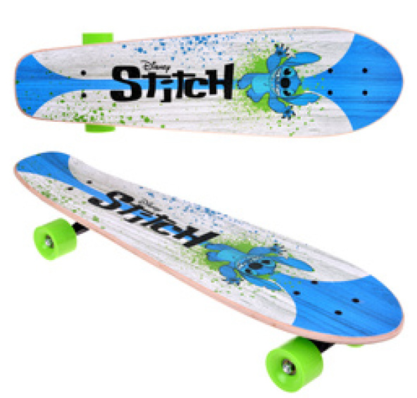 Skateboard s motivem pohádkového hrdiny Disney Stitch je ideální volbou pro děti a mladší uživatele, kteří začínají své dobrodružství s jízdou na skateboardu nebo prostě rádi tráví čas aktivně na čerstvém vzduchu. Barevný vzor s roztomilým Stitchem láká ke hře a solidní provedení zajišťuje bezpečnost a pohodlí během jízdy.