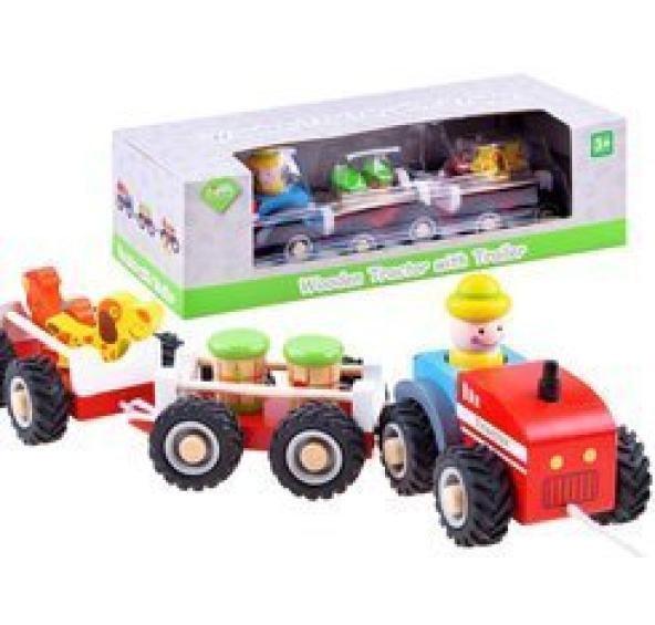 Dřevěný traktor s přívěsem pro každého malého farmáře. Velmi estetická hračka ve výrazných barvách a vzorech. Karoserie traktoru a přívěsu byla vyrobena ze dřeva a kola s vysokým vzorkem byla vyrobena z pryže. Hra s takovým vybavením bude pravděpodobně velmi fascinující. Traktor je dodáván se šňůrkou na tahání a odnímatelným řidičem. Vagony byly také obohaceny o cestující a náklad. Každý vůz má popruhy, které lze spojit dohromady, a tahač bude mít dva přívěsy.