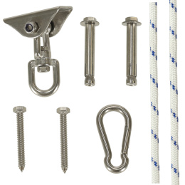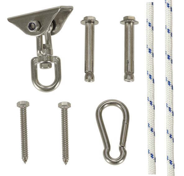 Závěsný držák umožňuje zavěsit závěsná sedadla kamkoli. Hlava se otáčí o 360°, takže houpání na houpačce je velmi příjemné. Materiál: ocel 304. Velikost plechovky: 7 cm x 4 cm.