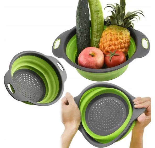 Silikonový skládací cedník s odkapávačem 24 cm. Je ideální pro oplachování čerstvého ovoce a zeleniny, scezení vařené zeleniny, rýže nebo těstovin.