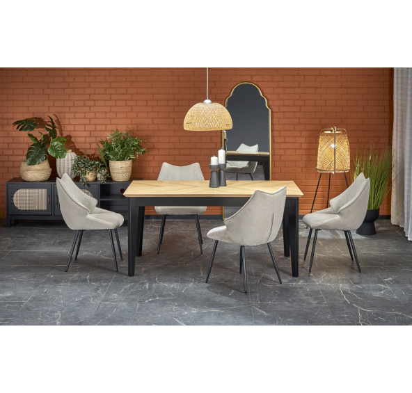 Popis produktu EDMONDO stół rozkładany dąb naturalny / czarny (2p=1szt)wymiary: 160-240/90/75/140 cm; stół rozkładany, materiał: płyta meblowa + okleina naturalana - dębowa / drewno lite - bukowe, kolor: blat - naturalny, nogi - czarny