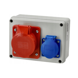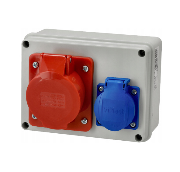 Má 2 deskové zásuvky, každá zásuvka je chráněna klapkou, která zvyšuje těsnost celého rozváděče.