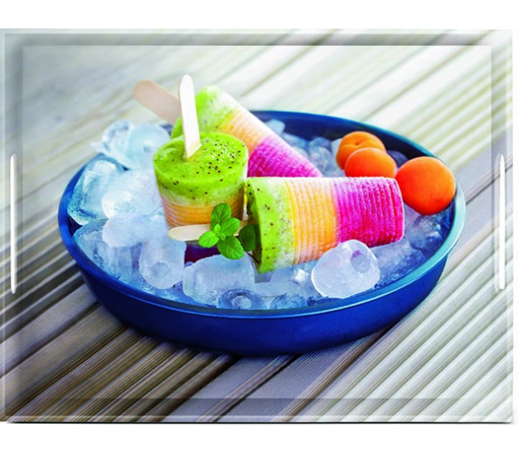 výborný pomocník při servírování doma i na zahradě vyrobeno z vysoce kvalitního plastu MF vlastnosti materiálu: neprůhledný, vysoký lesk, odolný proti poškrábání a pořezání stálobarevné, stohovatelné rozměry: 40 x 31 cm dekor: zmrzlina