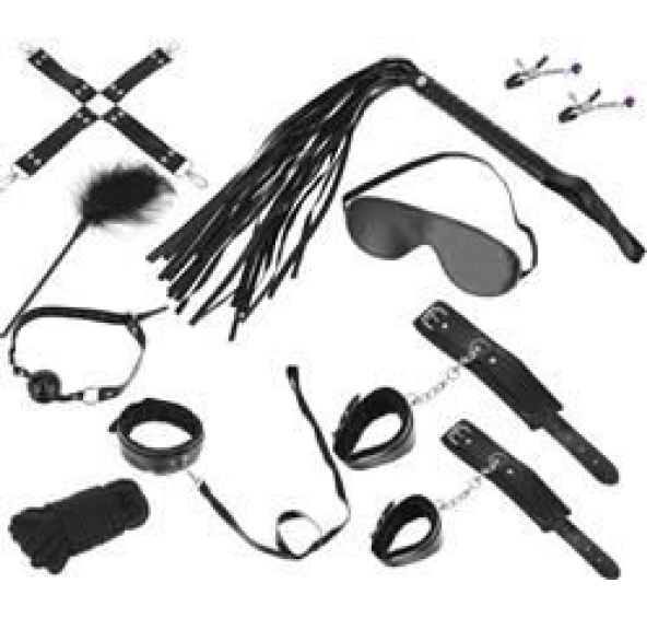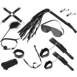 • 12 PRVKŮ - soubor se skládá z: 2 párů pout na nohy a ruce, silného lana, masky na oči, obojku s vodítkem, bičíku, roubíku s míčem, popruhů spojujících pouta, zavazování očí, vycpávek a svorek na bradavky . Díky svému bohatému obsahu vám umožní zbavit se rutiny v každé ložnici.