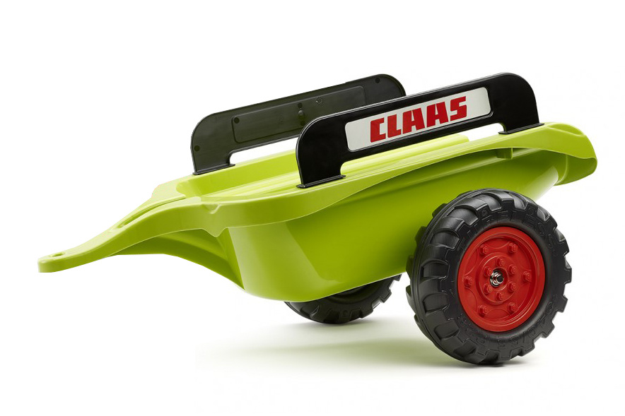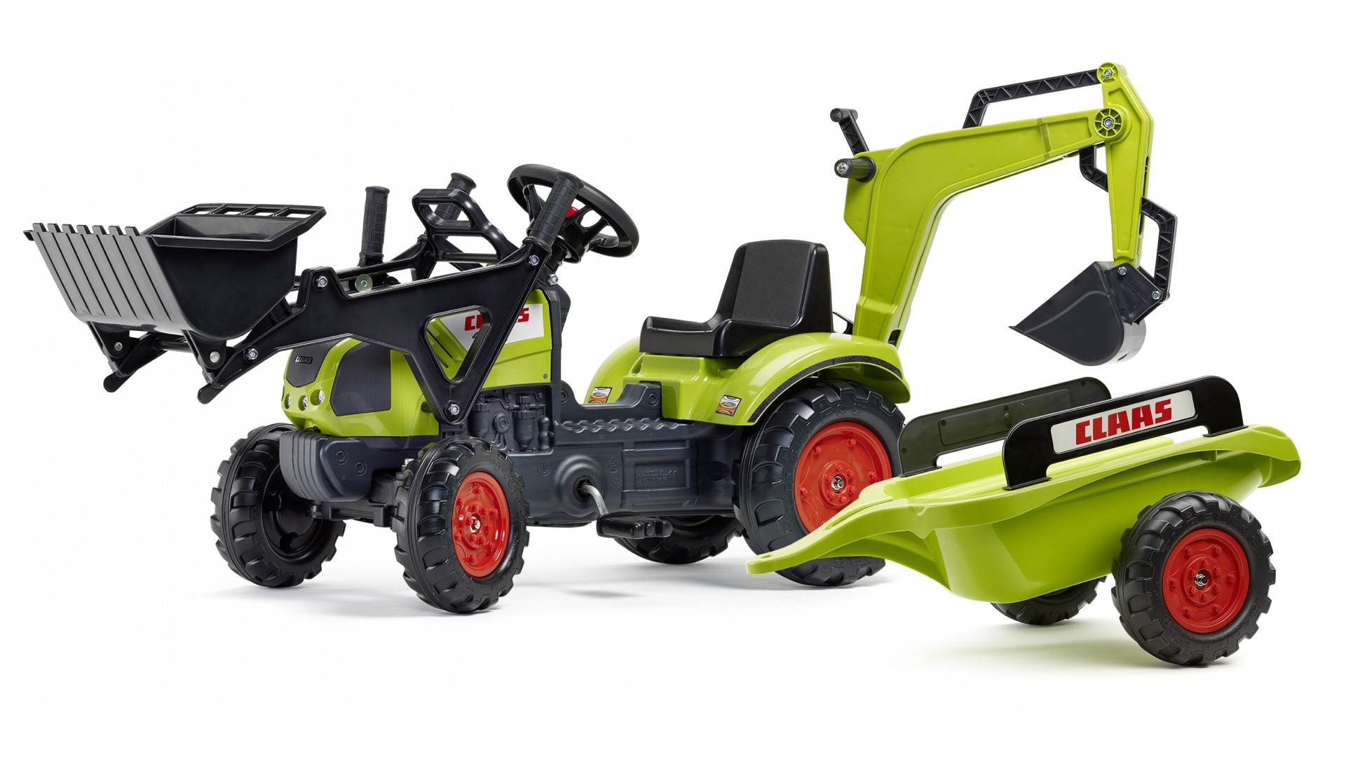 Šlapací traktor CLAAS ARION s nakládačem, rypadlem a vlečkou, funkčním klaksonem na volantě od francouzké firmy Falk, určený pro děti od 2 let.