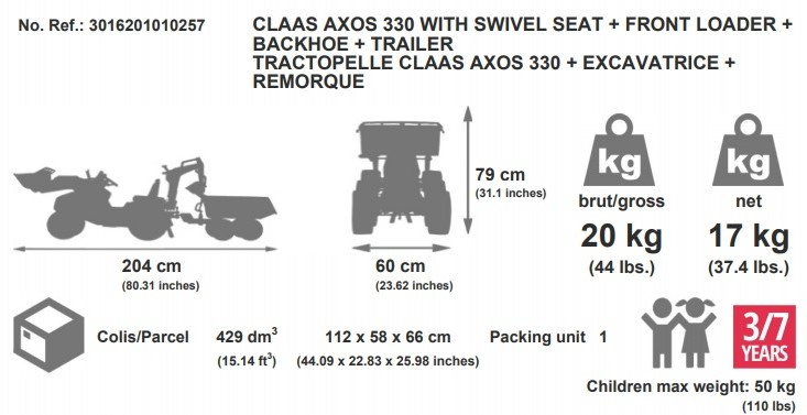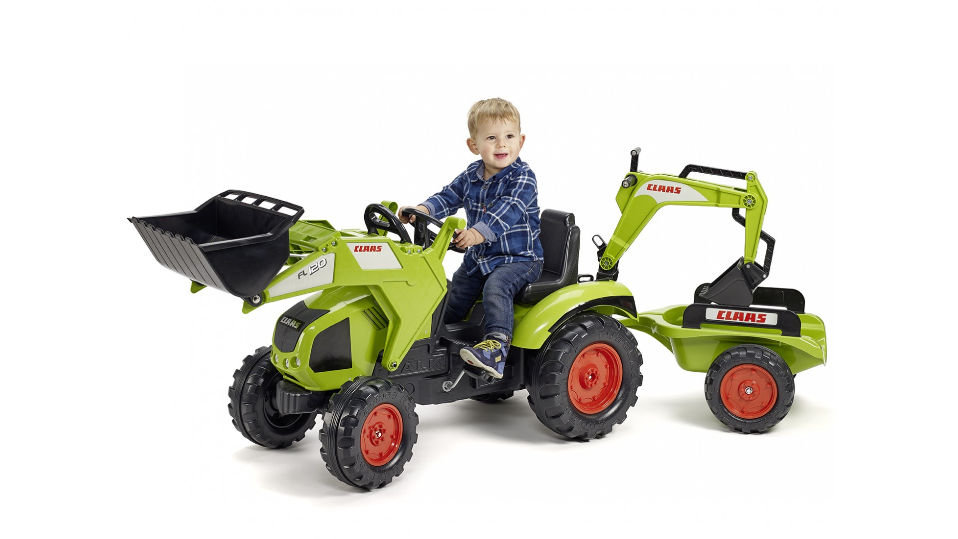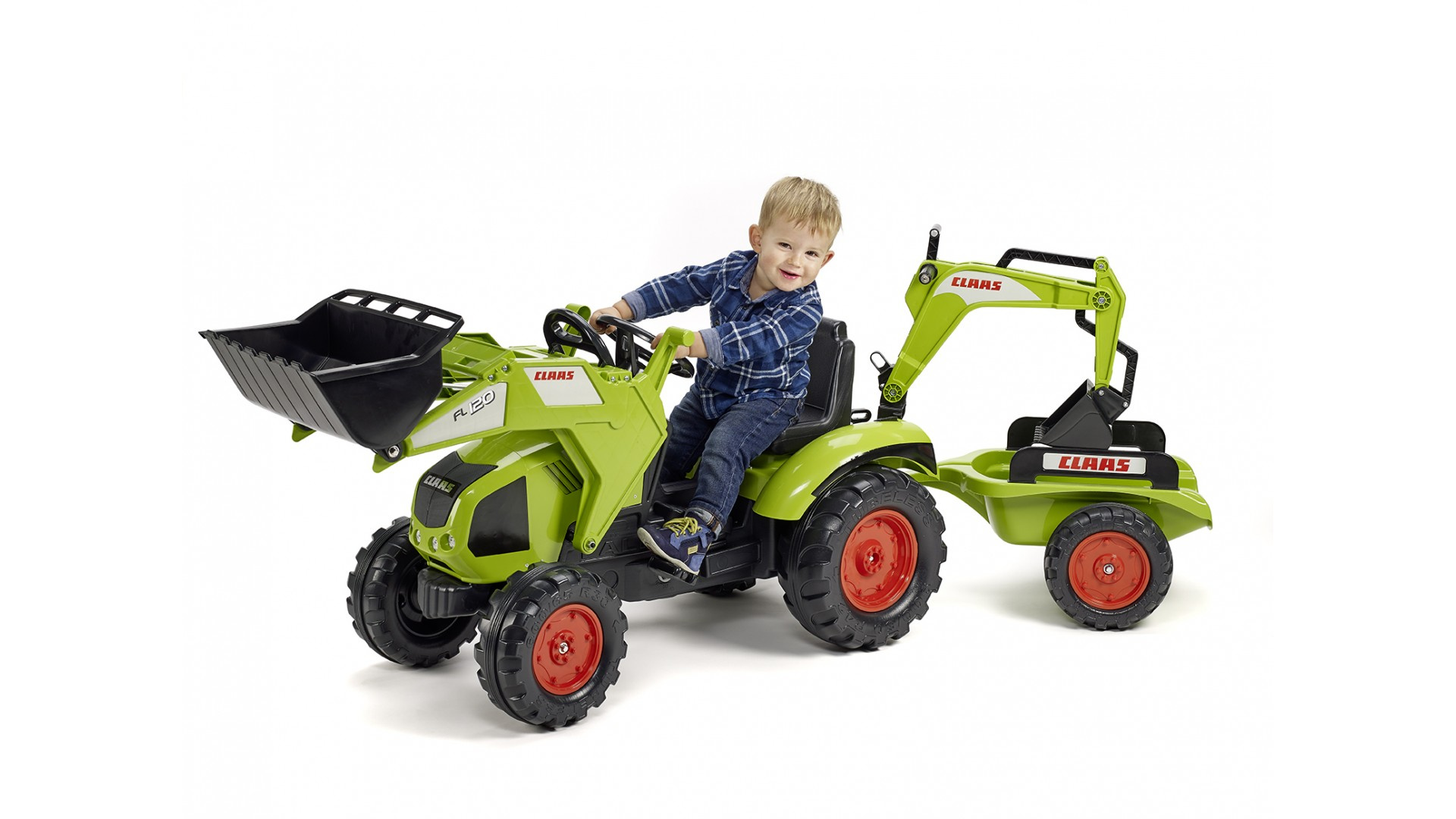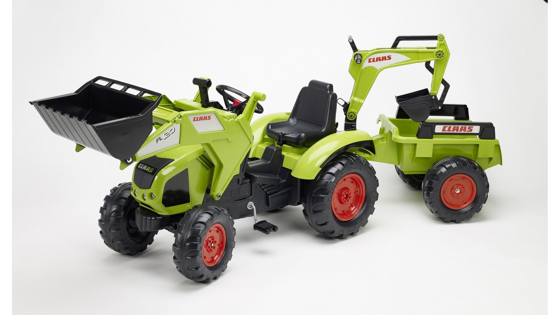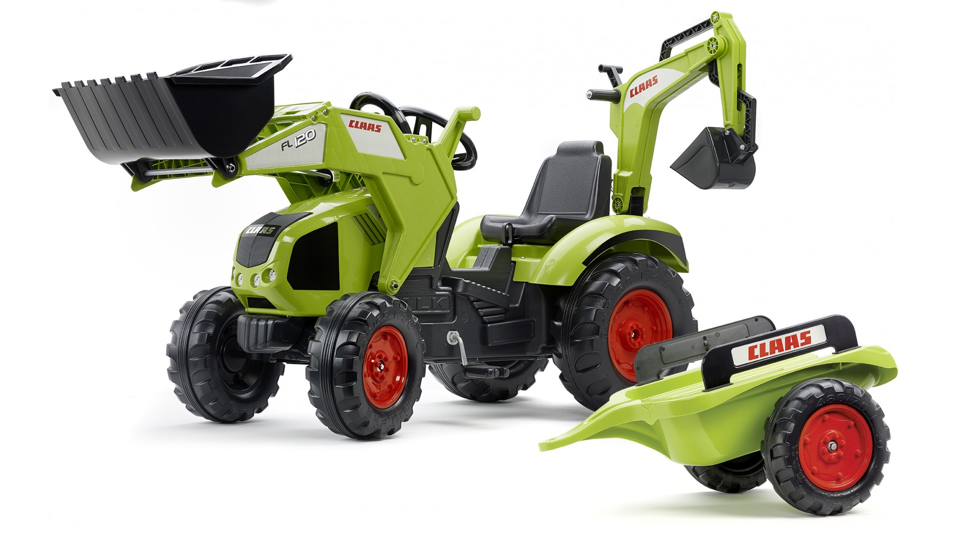 Šlapací traktor CLAAS AXOS s odpojitelnou vlečkou, rypadlem, nakladačem a funkčním klaksonem na volantě od francouzké firmy Falk, určený pro děti od 3 let.