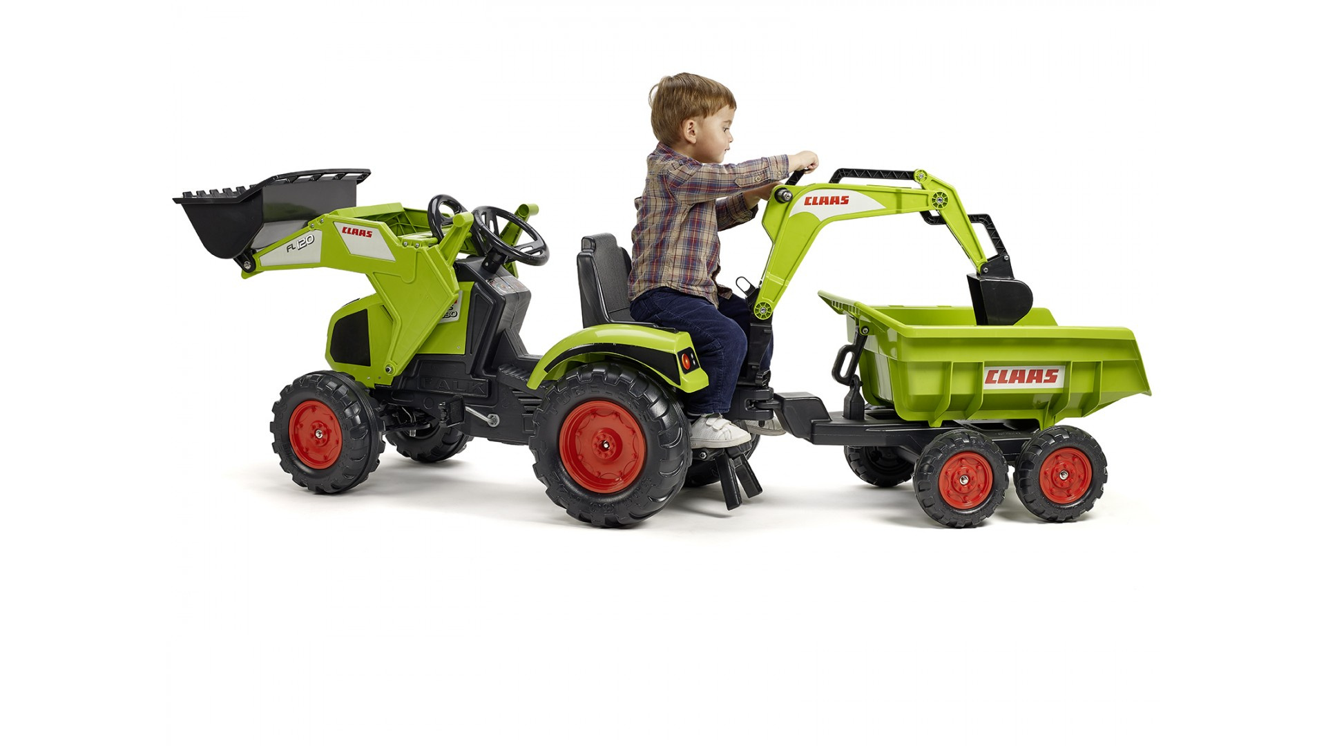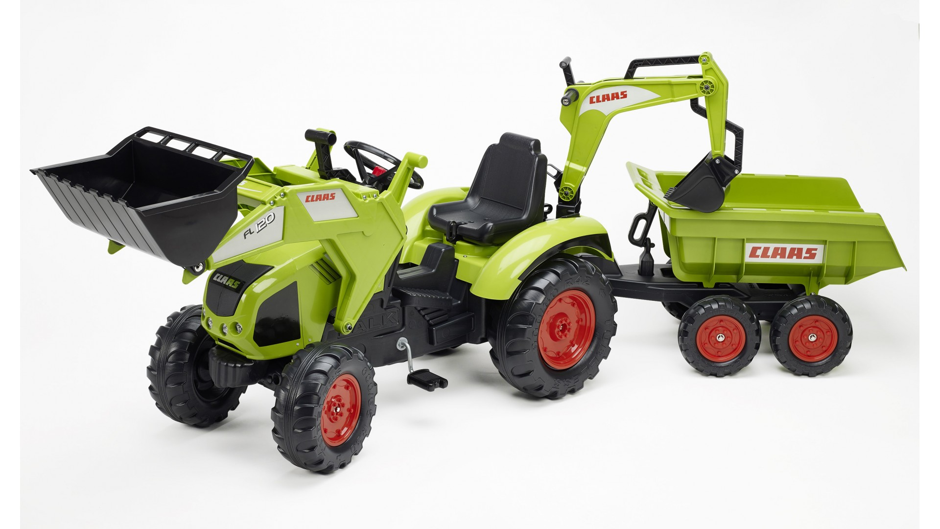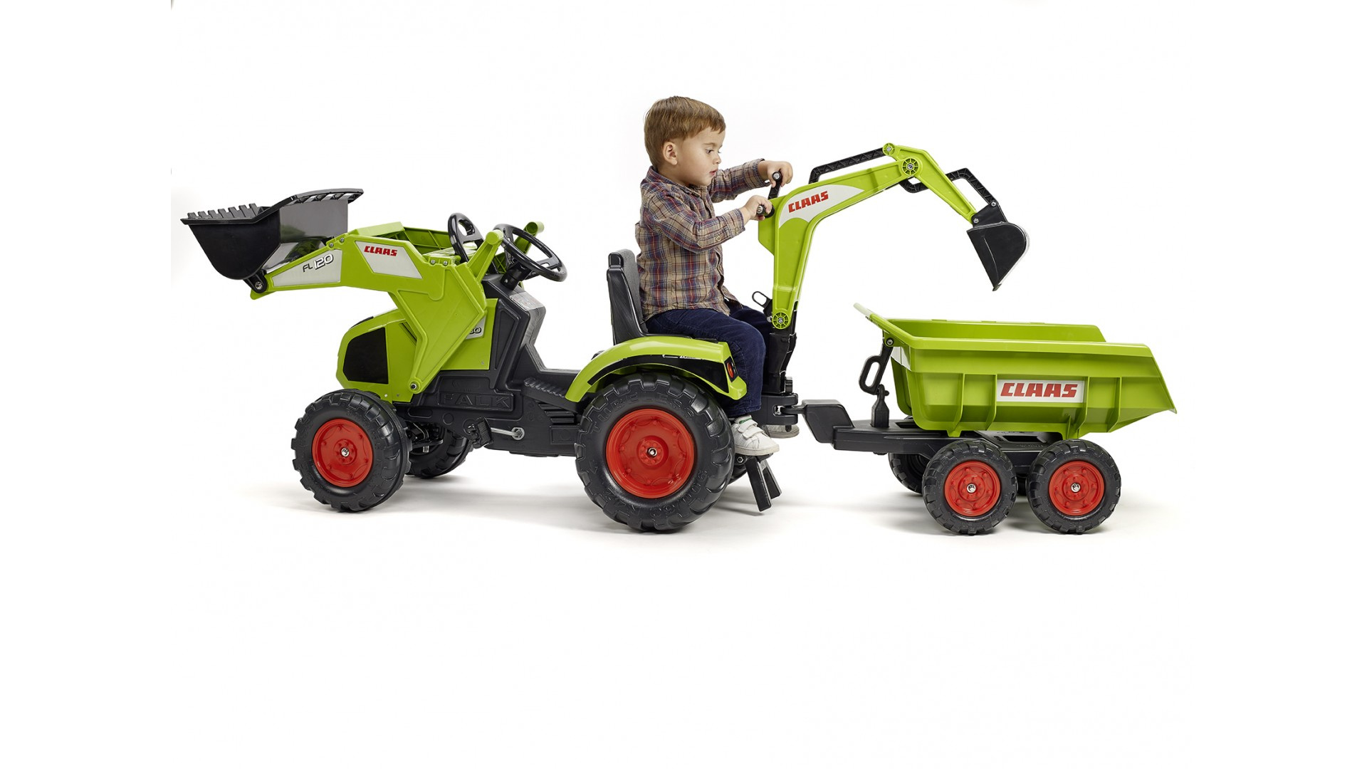 Šlapací traktor PRINCESS s odpojitelnou vlečkou, nakládačem, rypadlem a funkčním klaksonem na volantě od francouzké firmy Falk, určený pro děti od 3 let.