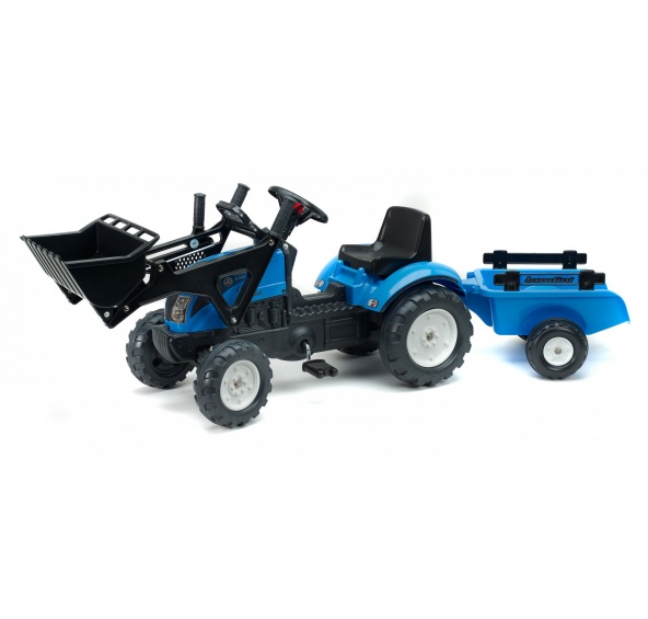 Šlapací traktor LANDINI POWERMONDIAL s vlečkou, funkčním klaksonem na volantě a nakladačem od francouzké firmy Falk, určený pro děti od 2 let.