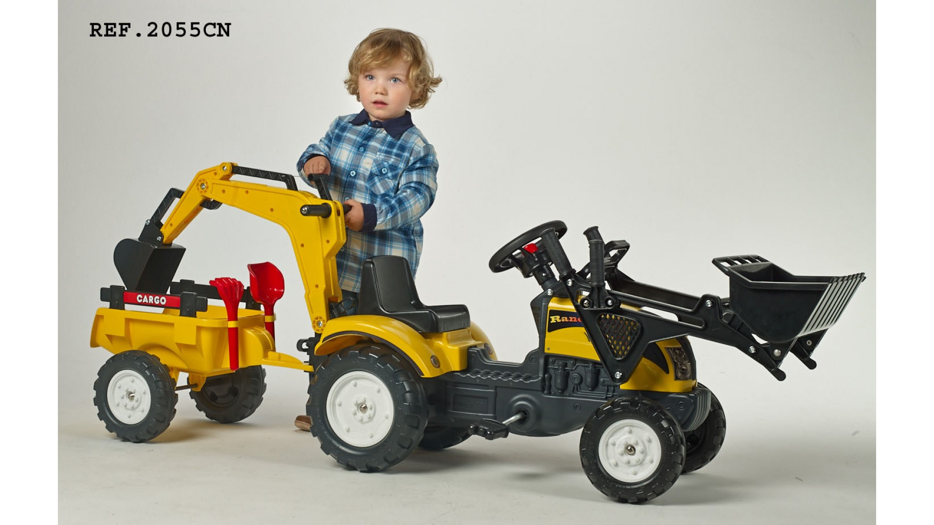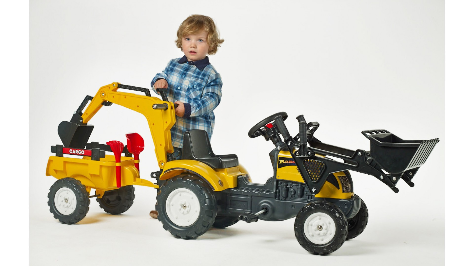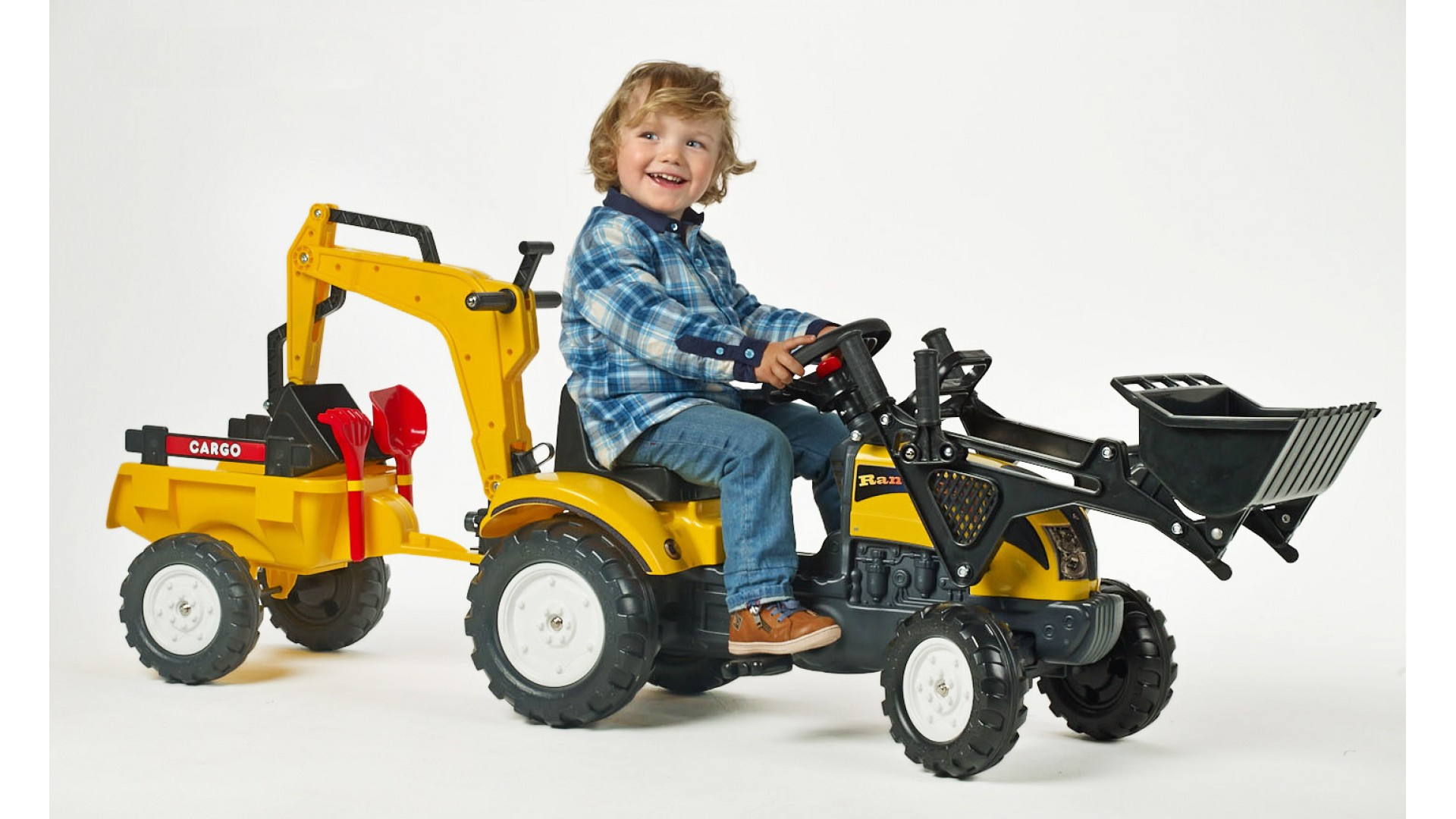 Šlapací traktor RANCH TRAC s odpojitelnou vlečkou, funkčním klaksonem na volantě, rypadlem, hráběmi a lopatkou na písek od francouzké firmy Falk, určený pro děti od 2 let.